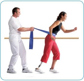 专业物理疗师配合使用弹性橡皮筋向后拽拉产生阻力。 ![]()